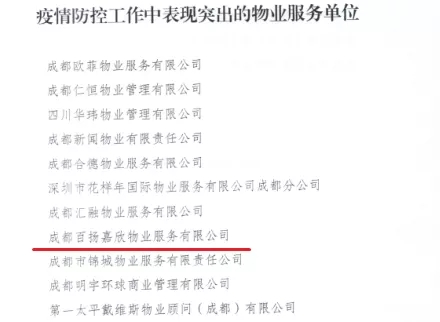 近日,成都锦江区住房建设和交通运输局对包括百扬嘉欣物业在内坚持做好防疫工作的22家物业进行了通报表扬。