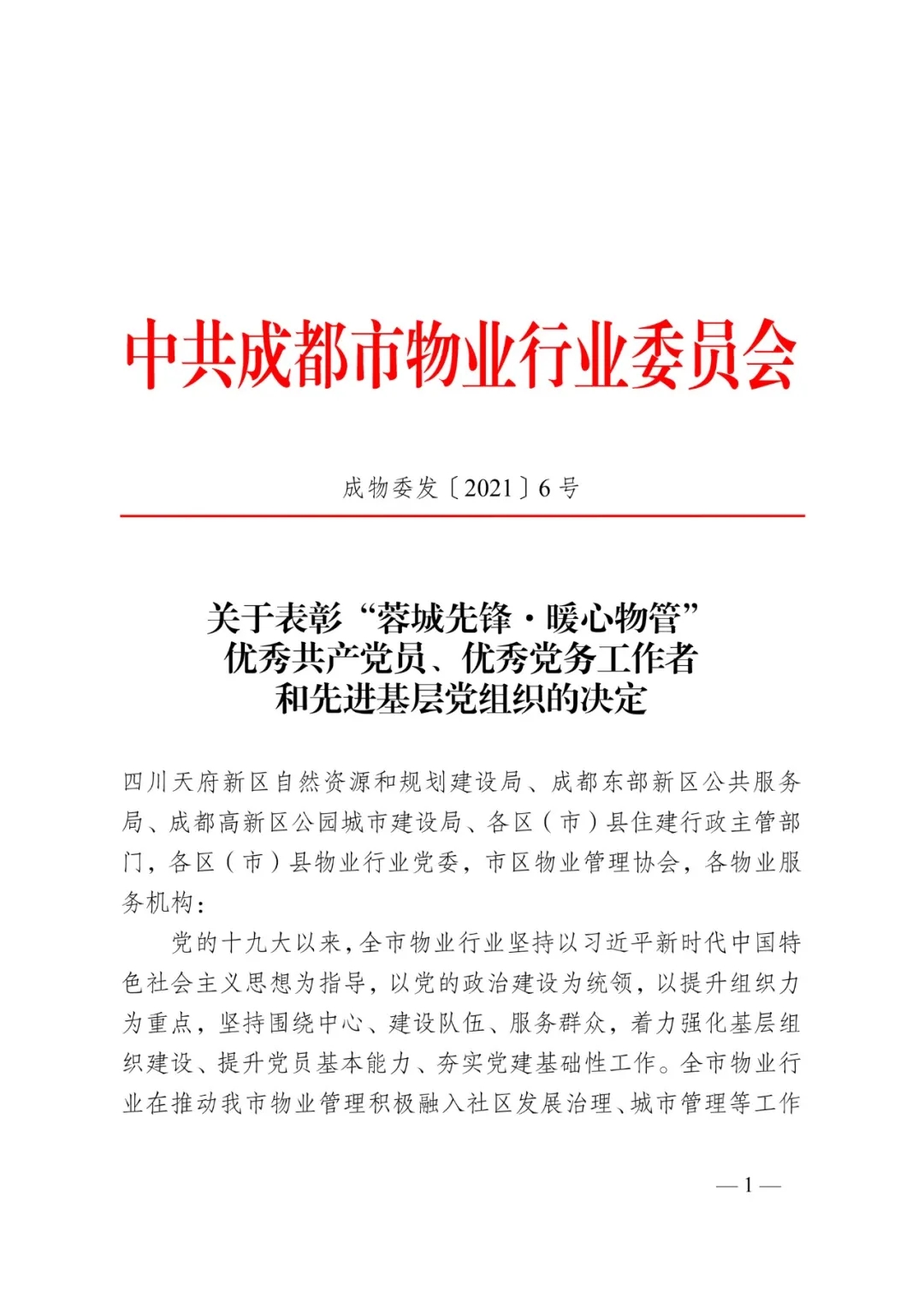为庆祝中国共产党成立100周年,为表彰先进、弘扬正气,中共成都市物业行业委员会决定:对优秀共产党员、优秀党务工作者、优秀支部委员会进行表彰。成都百扬嘉欣物业服务有限公司常务副总经理张艺文,因其在工作岗位上积极发挥女性党员的引领作用和奉献精神,并不忘社会责任,投身公益,表现突出荣获优秀党务工作者称号。 成都百扬嘉欣物业服务有限公司在对服务不断探索创新的同时,以党建为“牵引力”为客户营造最优质的办公环境。一步一个脚印,一步一个台阶,党建引领成都百扬嘉欣物业服务有限公司发展结出累累硕果。我们将继续坚持“用心 服务于心”去温暖我们的客户,用“瞻世界 赢未来”的胸怀去拥抱新时代!