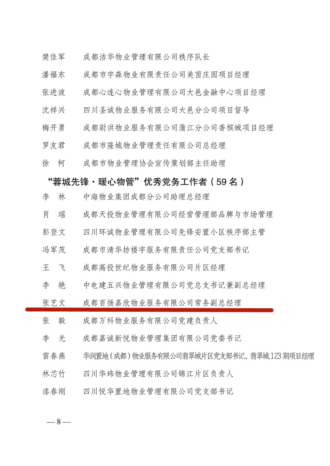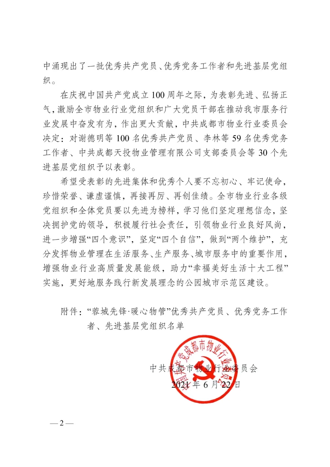为庆祝中国共产党成立100周年,为表彰先进、弘扬正气,中共成都市物业行业委员会决定:对优秀共产党员、优秀党务工作者、优秀支部委员会进行表彰。成都百扬嘉欣物业服务有限公司常务副总经理张艺文,因其在工作岗位上积极发挥女性党员的引领作用和奉献精神,并不忘社会责任,投身公益,表现突出荣获优秀党务工作者称号。成都百扬嘉欣物业服务有限公司在对服务不断探索创新的同时,以党建为“牵引力”为客户营造最优质的办公环境。一步一个脚印,一步一个台阶,党建引领成都百扬嘉欣物业服务有限公司发展结出累累硕果。我们将继续坚持“用心 服务于心”去温暖我们的客户,用“瞻世界 赢未来”的胸怀去拥抱新时代!