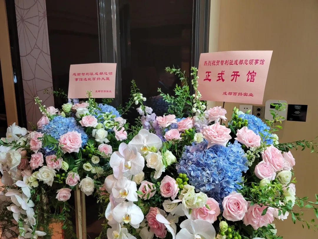 7月8日上午10时许,成都华尔道夫酒店内一派热闹景象,外国驻川领事机构“大家庭”迎来新成员:智利驻成都总领事馆今天正式开馆,领区范围包括四川省、重庆市、贵州省、云南省和陕西省。百扬大厦作为智利驻成都总领事馆办公选址单位,也应邀参与了此次开馆仪式。