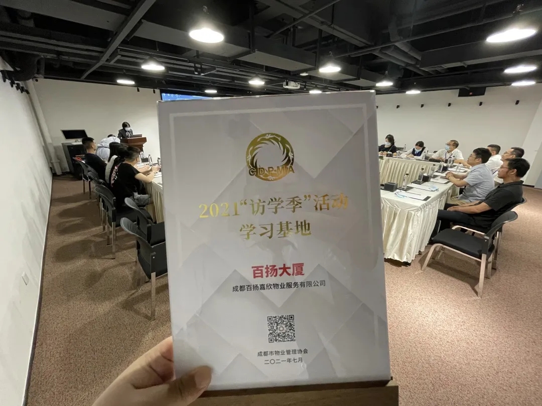 成都市物业管理协会“访学季”活动 7月22日,由成都市物业管理协会举办的访学季活动走进百扬大厦,协会领导、行业专家以及近30名物业同行们就大厦的硬件设施设备、相关物业服务内容、楼宇特色化个性化服务等方面进行了深入的考察与交流。 活动开始前,由成都市物业协会副秘书长杨静波向百扬大厦予以2021“访学季”活动基地授权牌。百扬大厦副总经理张延年代表公司接牌。
