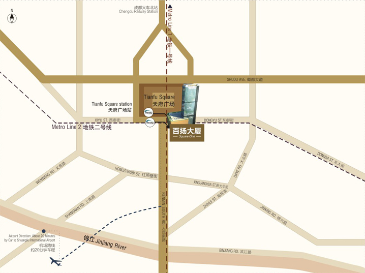 天府广场是城市地铁网络、公交网络的核心枢纽。地铁1、2号线在此组成地下零换乘枢纽,便捷出行随心所欲。近30条线路编制的公交路网,直接通达城市各处。此外,仅需20分钟即可到达成都双流国际机场,飞往全球各大城市。